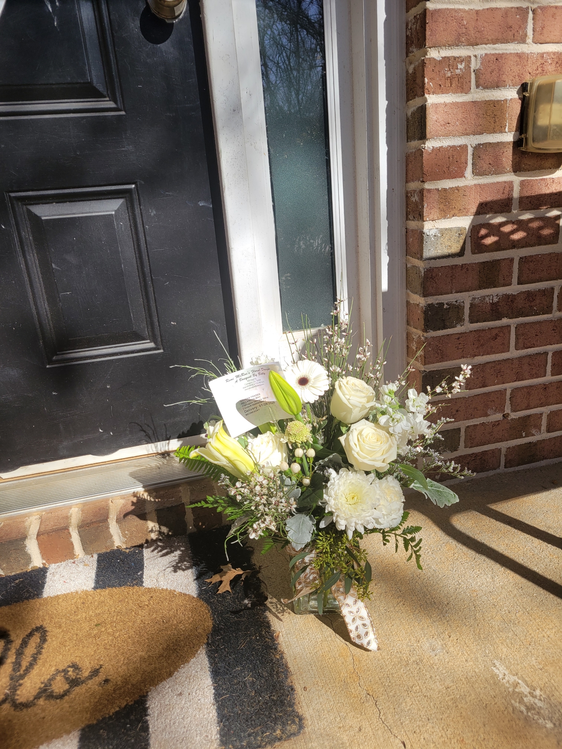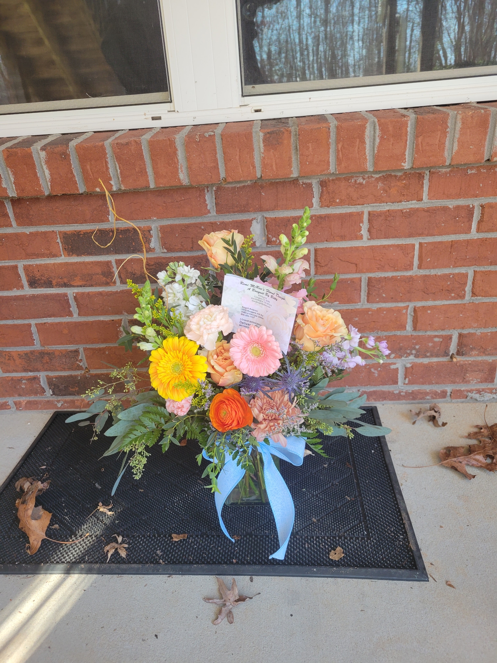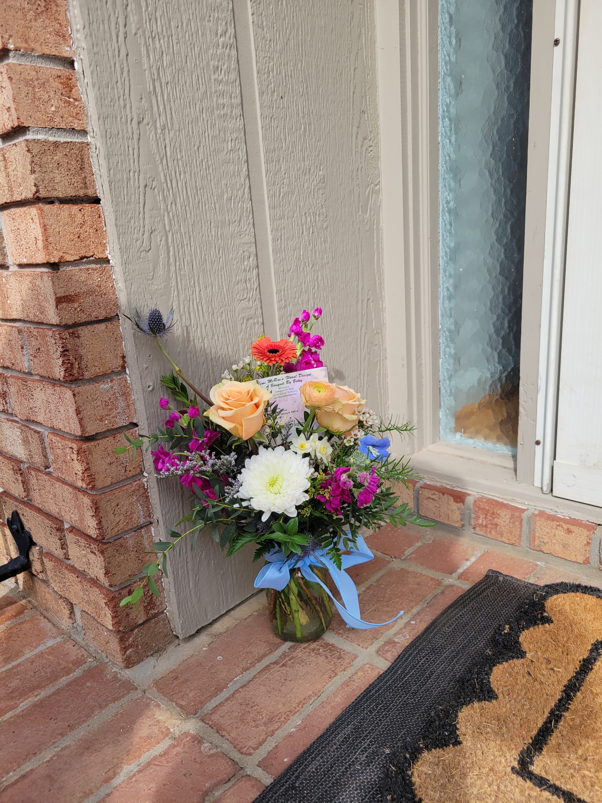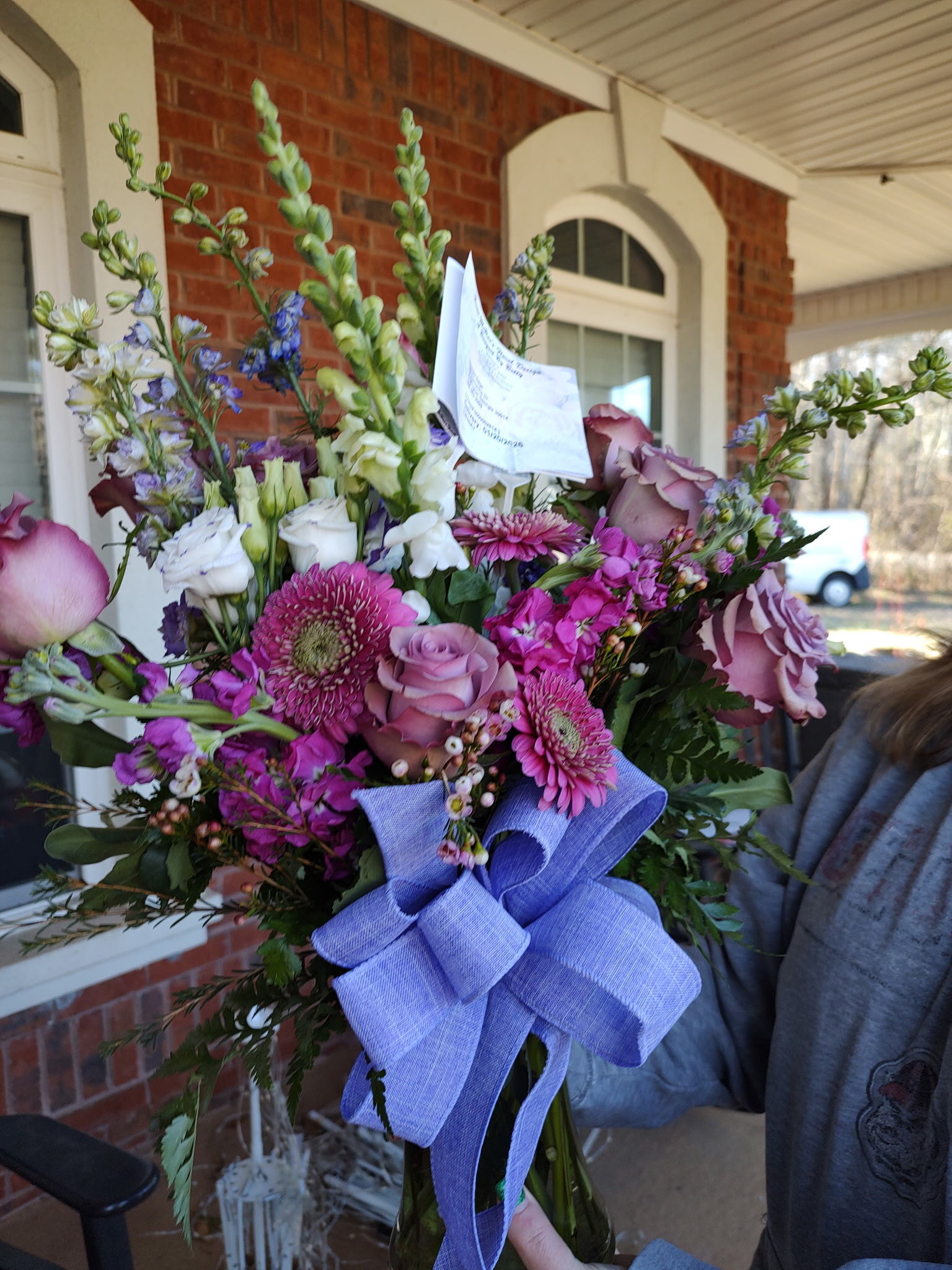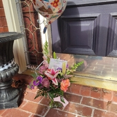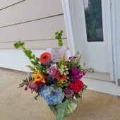 A lovely spur-of-the-moment delivery to my dear friend, after the loss of her husband. The colors and arrangement made her smile.