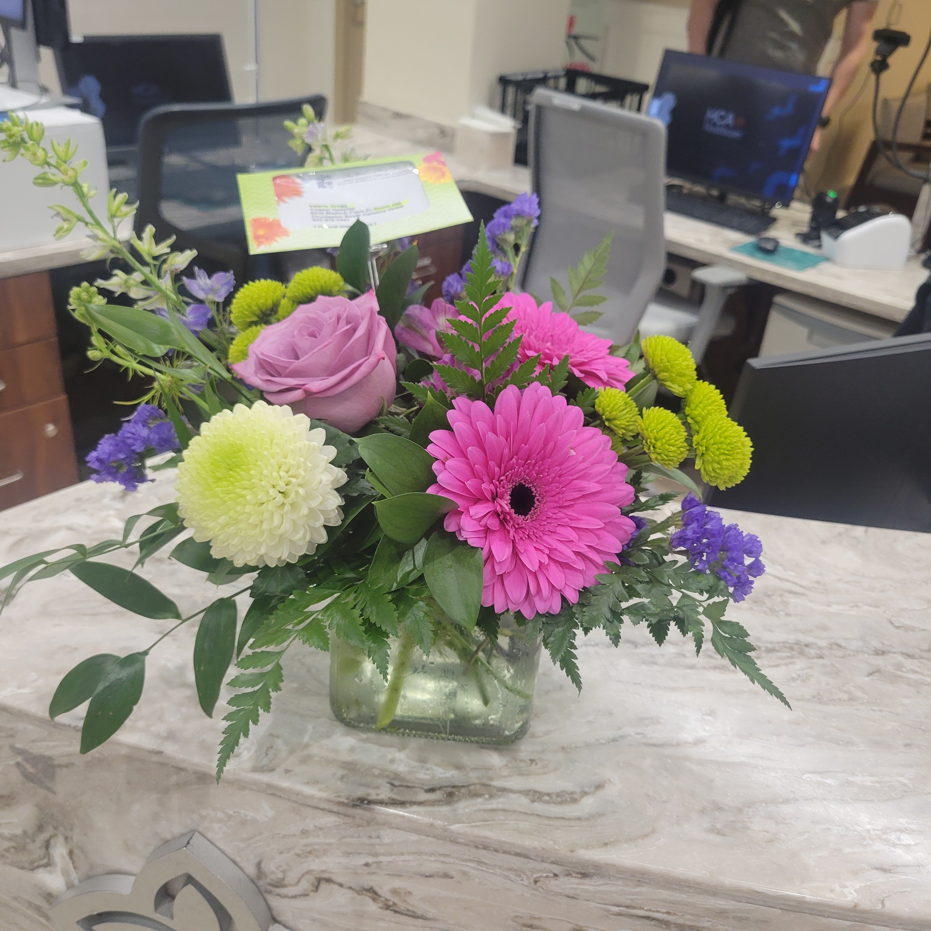 I love out of town and looked online to order flowers for my daughter, who is new to the area and working as a nurse. I read many good reviews so I took a chance. Veronica took my order and was so incredibly sweet. My daughter got the flowers at a time that couldn’t have been planned any better and they were absolutely beautiful. I would highly recommend them and will definitely be calling them again when I need flowers. Thank you again for your help.